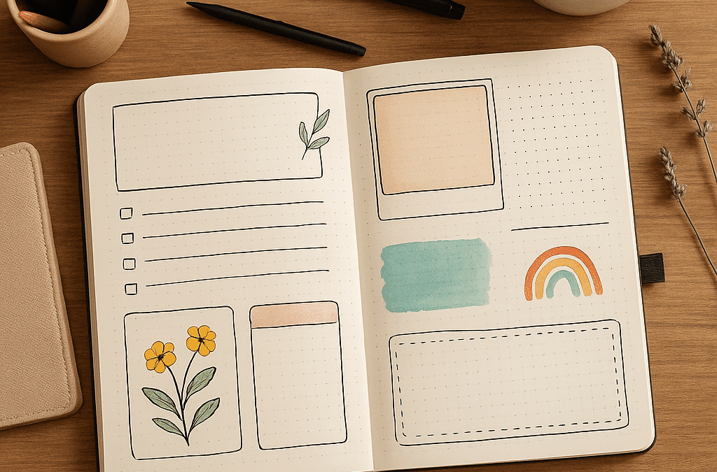 - Washi tape i naklejki — szybki sposób na ozdobę stron.